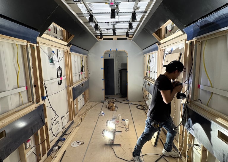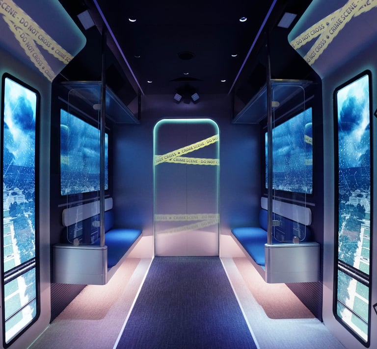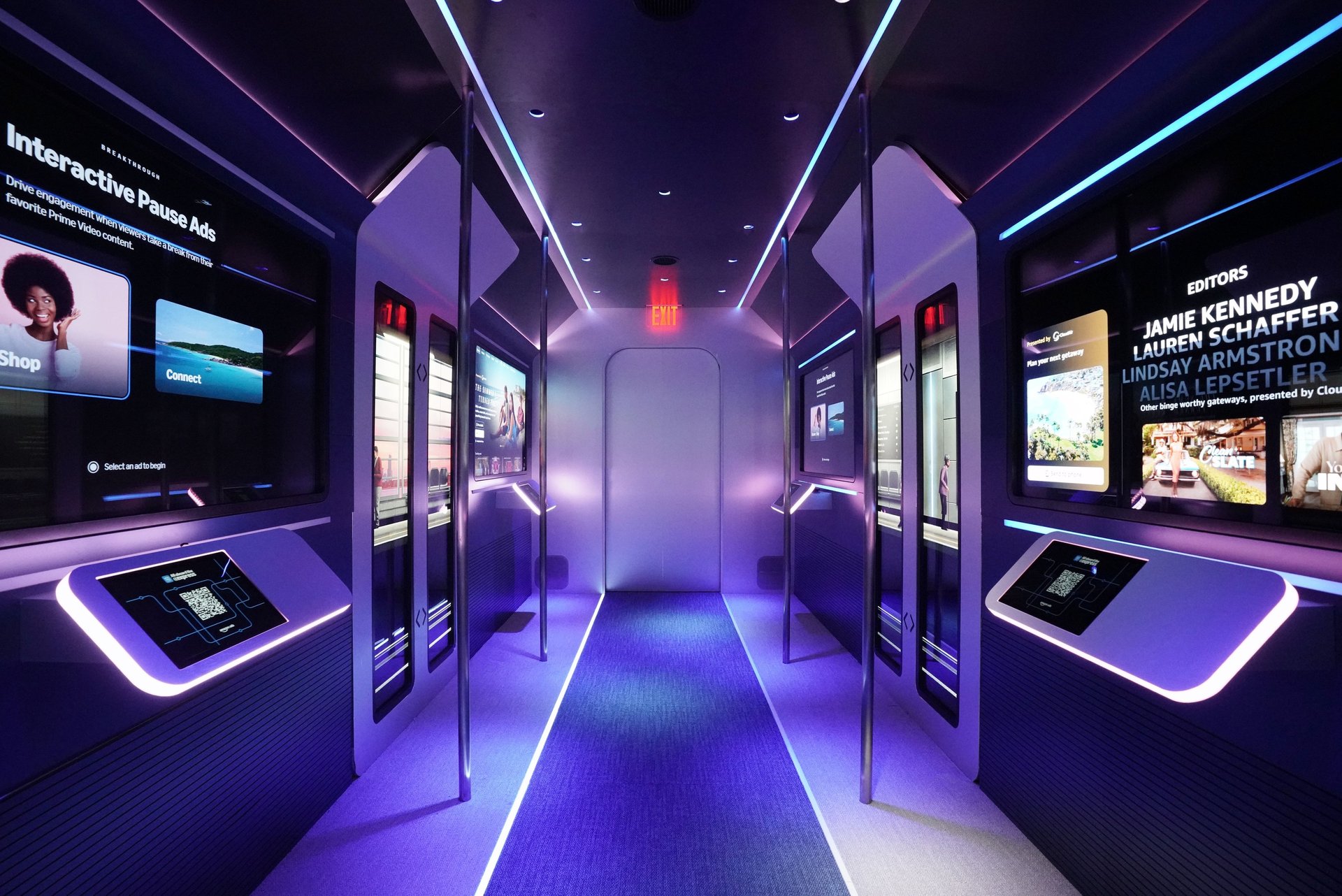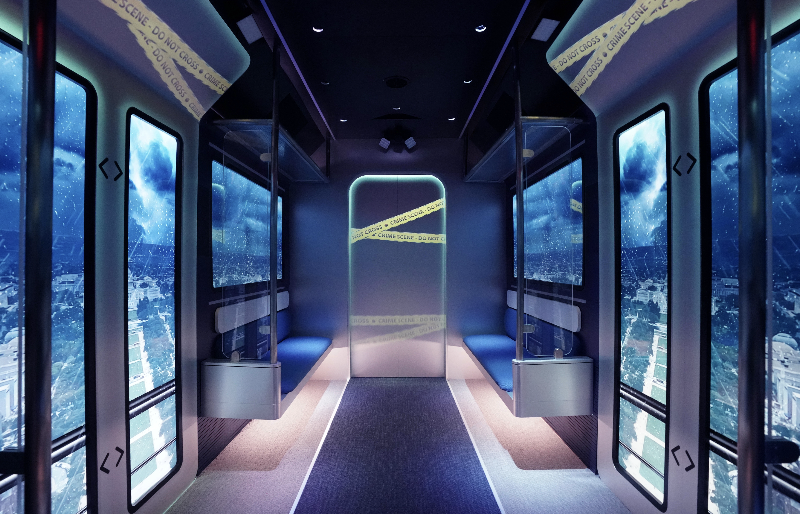 Every inch of the container was carefully designed to capture the authentic feel of a train. Angled ceilings, handrails, and bench seating created a true transit environment, while strategically placed LED lighting synced with the on-screen content. As visuals shifted, lights pulsed and seats vibrated, giving visitors the sensation of movement and pulling them deeper into the story.