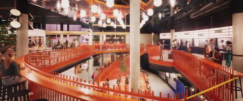 Based in an old IMAX theatre in Potsdamer Platz. The food hall echoes its past with dark tiling, bold signage and ticket kiosks.