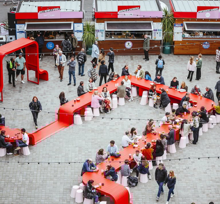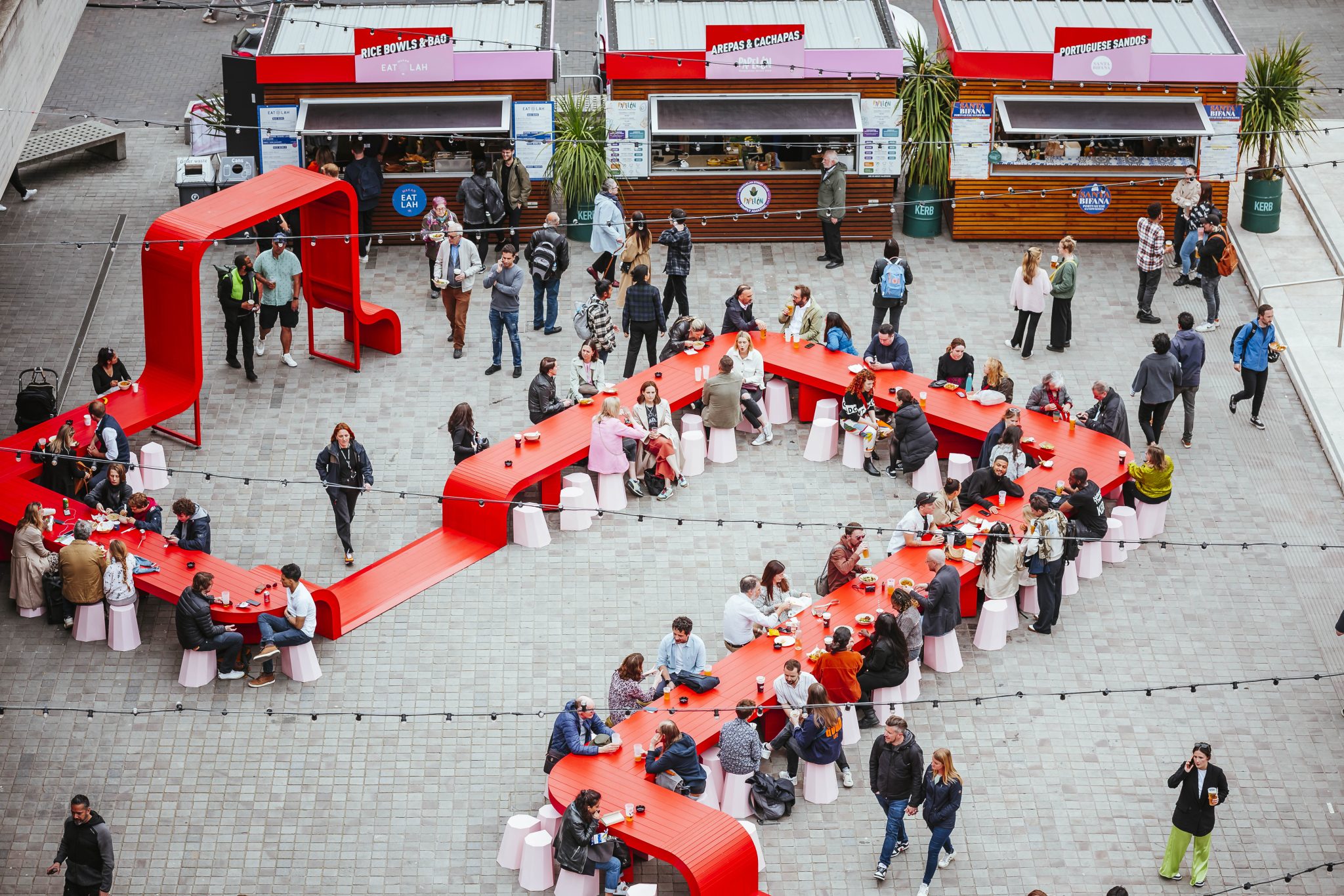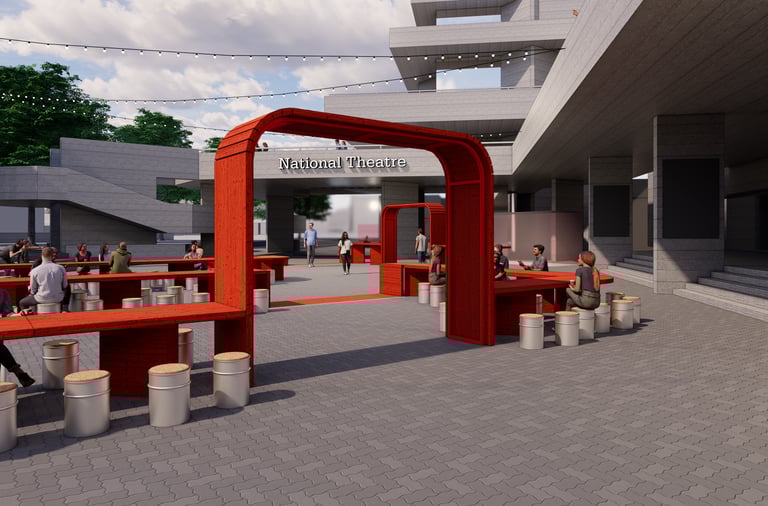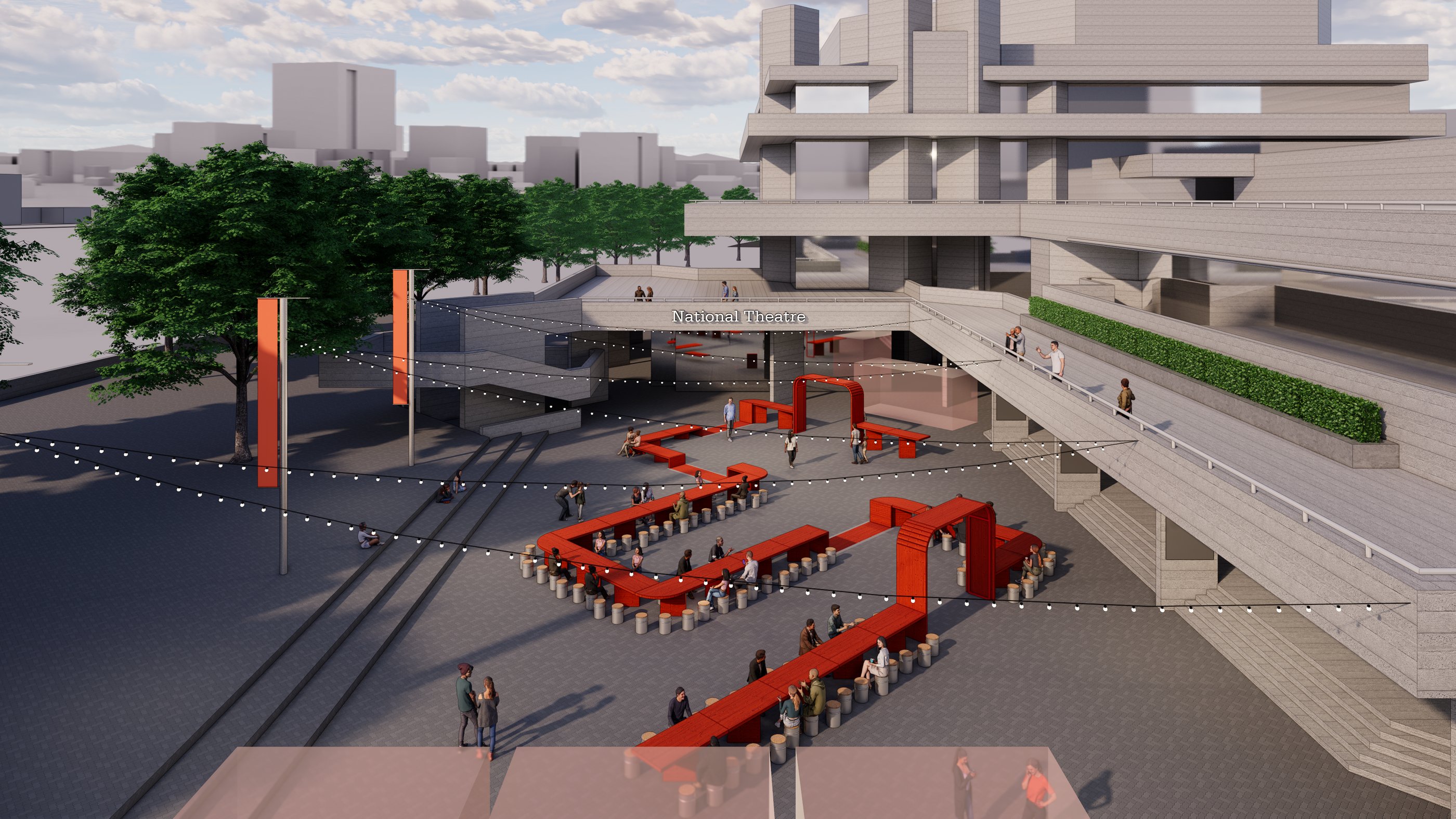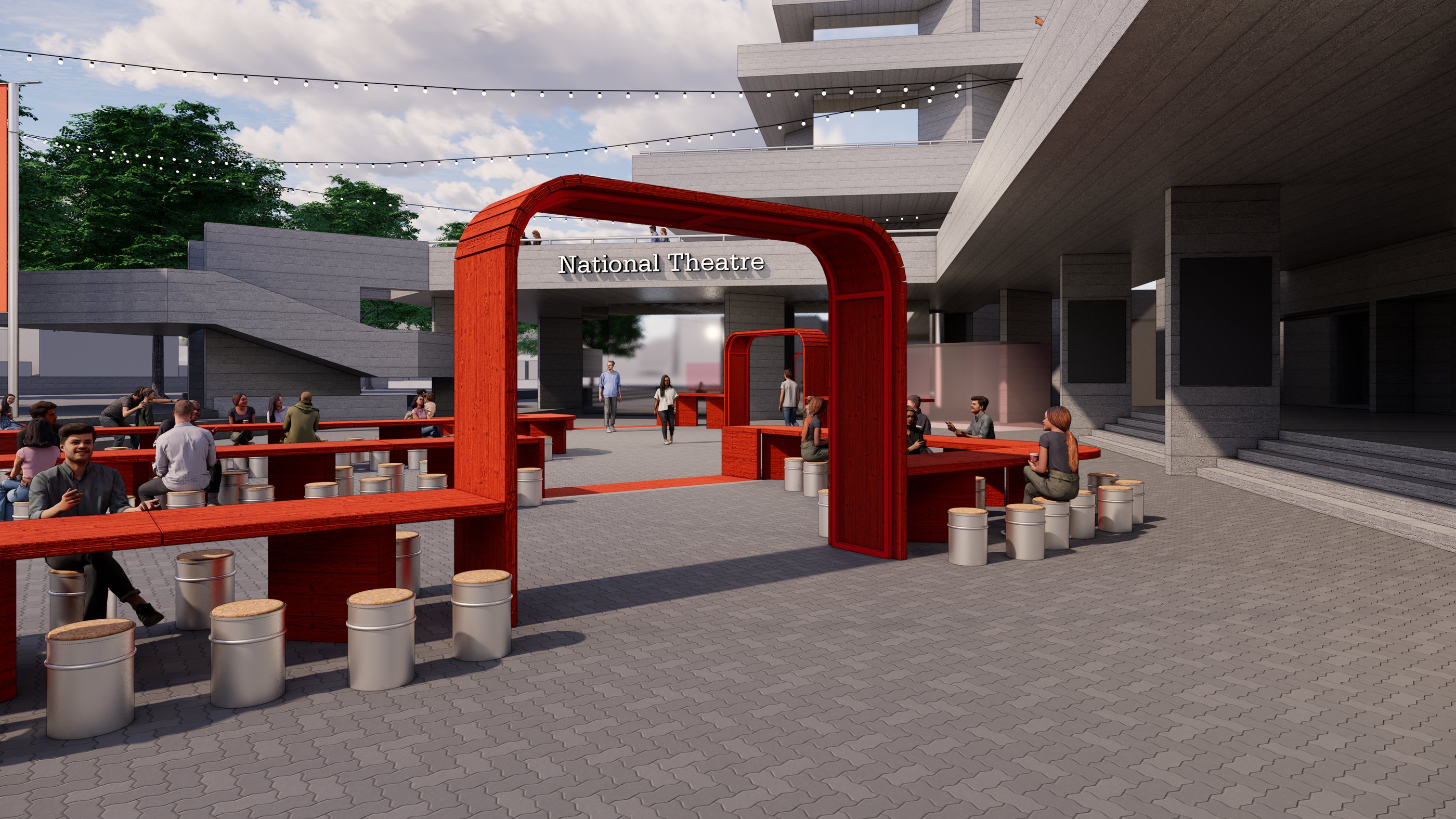 We created 'The Table'. A place to meet, hold events and dine. In National Theatre red, the table branches out at 45 degrees from the centre of the building. Encouraging interaction with each other and the theatre.