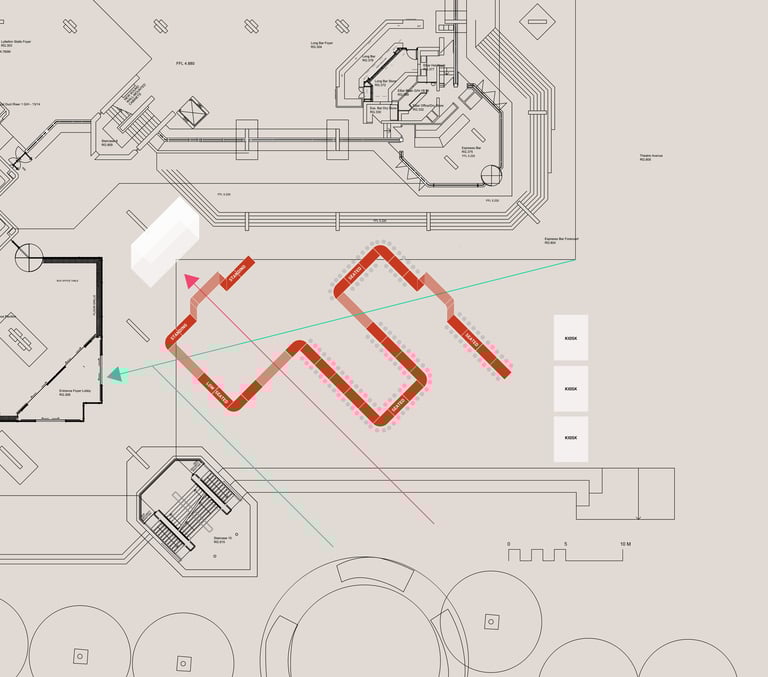 Designed at 45 degrees to eco the monolithic architecture of The National Theatre. Each archway and walkthrough was designed to align with all entrances but still retain the modular design.